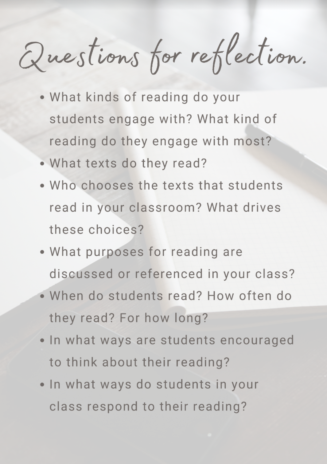 In this blog series, we will explore ways that we can strategically incorporate different approaches to reading that create meaningful experiences for lower to intermediate secondary readers. In the meantime, check out some possible questions for reflection below: